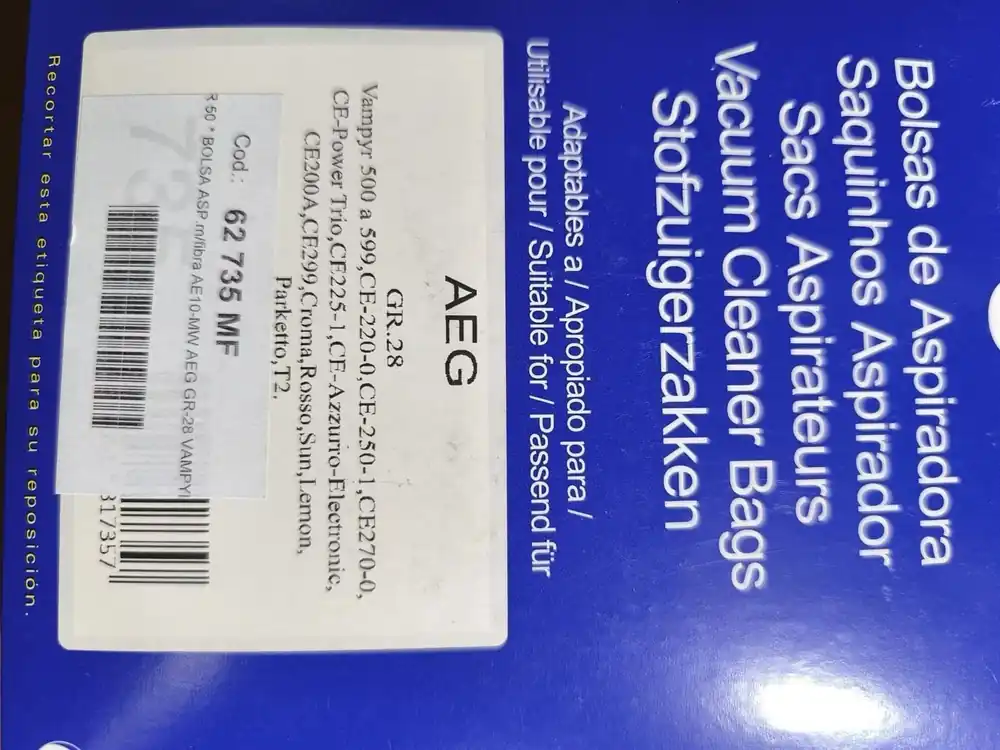 ¡Oferta! BOLSA ASPIRADOR AEG, PAQUETE 5 BOLSAS MICROFIBRA, GR28,62735MF Precio Rebajado8,98 € El precio original era: 8,98 €.4,49 €El precio actual es: 4,49 €. BOLSA ASPIRADOR AEG, PAQUETE 5 BOLSAS MICROFIBRA, GR28,62735MF Precio Rebajado cantidad Añadir al carrito Flete: Se cobrará un suplemento de 4,95 € en envíos inferiores a 79 €. Devolución y reembolso en un plazo de 30 días. Pago seguro mediante métodos de pago verificados. Métodos de pago SKU: SK0041697-ES20260409-170754 Categoría: Aspiradoras Repuestos Etiqueta: AEG Descripción Información BOLSA ASPIRADOR AEG, PAQUETE 5 BOLSAS MICROFIBRA, GR28, 62735MF Productos relacionados ¡Oferta! Junta termostato secadora|compatible con AEG|Calidad Original|Codigo fabricante 140066097019|Modelos L14850 T65770IH4 TBDEE862 T Económico 24,53 € El precio original era: 24,53 €.12,27 €El precio actual es: 12,27 €. Añadir al carrito ¡Oferta! Resistencia lavadora|compatible con AEG|Calidad Original|Codigo fabricante 3792301305|Para modelos L60260FL L60270FL L60468FL L6 Envío Inmediato 60,22 € El precio original era: 60,22 €.30,11 €El precio actual es: 30,11 €. Añadir al carrito ¡Oferta! Motor secadora|compatible con AEG|Calidad Original|Codigo fabricante 8588072524024|Para modelos T86590IH3 AT65385IH3 Envío Inmediato 131,59 € El precio original era: 131,59 €.52,64 €El precio actual es: 52,64 €. Añadir al carrito ¡Oferta! Ordena Ya Microretardo puerta lavadora ZANUSSI|compatible con AEG|Calidad OEM|Codigo fabricante 8070202018|Para modelos L73476FL L73482FL 13,38 € El precio original era: 13,38 €.6,69 €El precio actual es: 6,69 €. Añadir al carrito