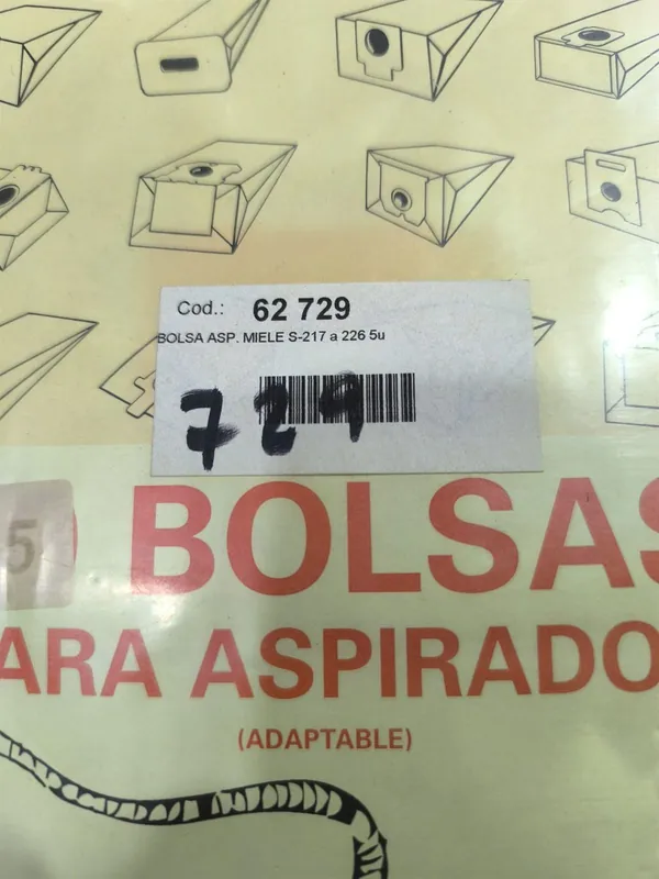 BOLSA ASPIRADOR MIELE, CAJA 5 BOLSAS PAPEL+2FLTROS, CARTON 93MM, DIAMETRO 44, RECAMBIO ALTERNATIVO, 62729