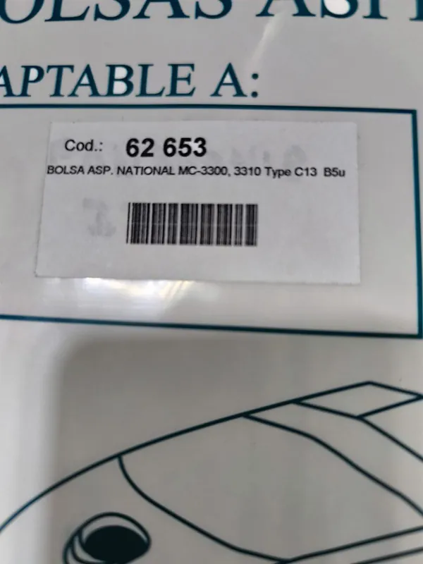 BOLSA ASPIRADOR NATIONAL,MC3300,MC3310, CAJA 5 BOLSAS PAPEL, CARTON119/109113/103MM, DIAMETRO 52MM, 62653