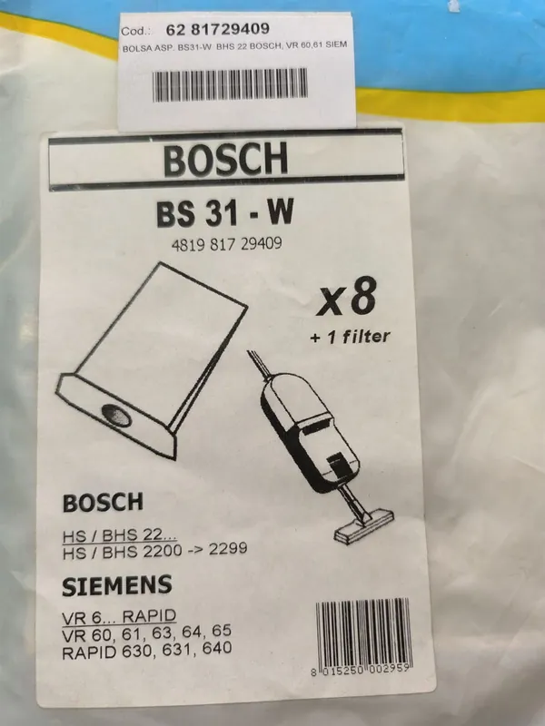 BOLSA ASPIRADOR BOSCH, SIEMENS, VER MODELOS FOTO, PAQUETE 8 BOLSAS+1FILTRO, RECAMBIO ALTERNATIVO, 00460446