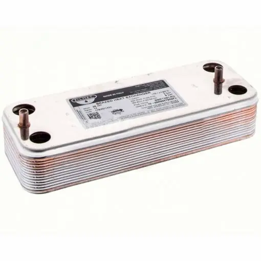 Intercambiador de placas compatible con calderas Junkers ZW24KE, fabricado por Zilmet, diseñado para ofrecer un alto rendimiento térmico y fiabilidad en el funcionamiento de tu sistema de calefacción. Con 14 placas de intercambio y una distancia entre conexiones de 171 mm, es un repuesto ideal para sustituir el original deteriorado, asegurando un rendimiento duradero y eficiente.