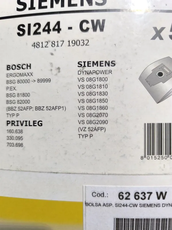 BOLSA ASPIRADOR SIEMENS, BOSCH, CAJA 5 BOLSAS, VER FOTO MODELOS, SI244-CW