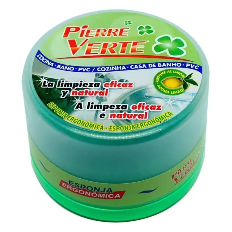 Limpia, pule y protege todas las superficies: plata, cobre, superficies cromadas, acero inoxidable, estaño, aluminio, materiales acrílicos, vitrocerámicas, baldosas y juntas de baldosas etc. Ideal para cocinas :utensilios de cocina (estaño, cobre…), griferías, encimera, neveras… Ideal para baños: griferías, juntas de baldosas, lozas, duchas, pilas, baños… Ideal para renovar las superficies en PVC: muebles de jardín, líneas de flotación de las piscinas, cenadores, ventanas, verandas, etc. Modo de empleo: Humedecer la esponja y impregnarla con Pierre Verte hasta que haga espuma. Aplicar sobre la superficie a limpiar. Aclarar con agua. Secar con un paño de microfibras. Después de su utilización, dejar secar antes de cerrar el envase.
