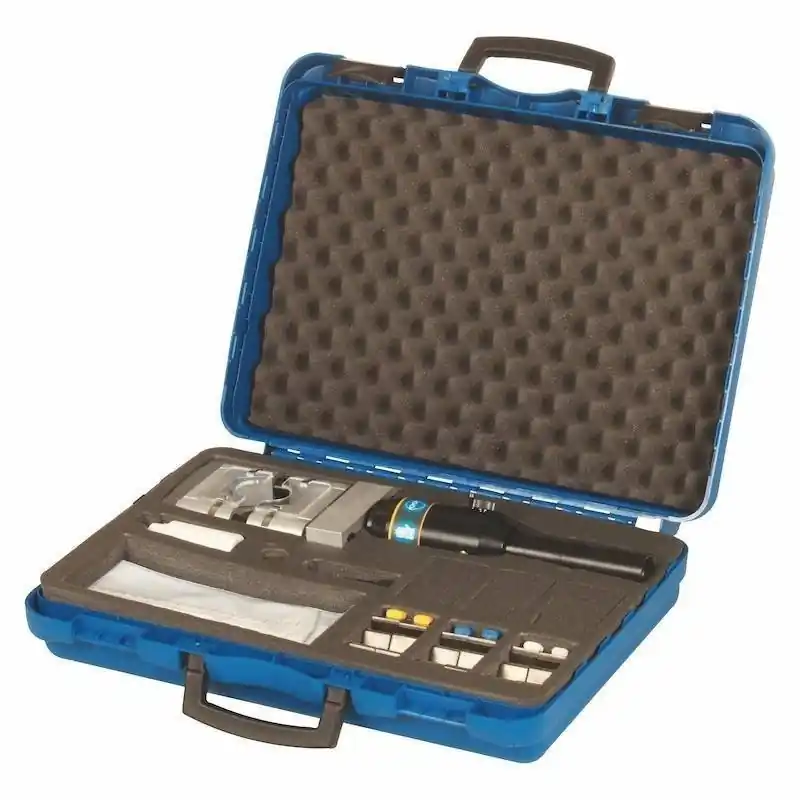 La prensa engatilla todos los racores en aluminio y acero de un modo seguro y uniforme, y además, es posible verificar la precisión. El diámetro del prensado puede ser verificado utilizando el calibre especial incluido en el kit.